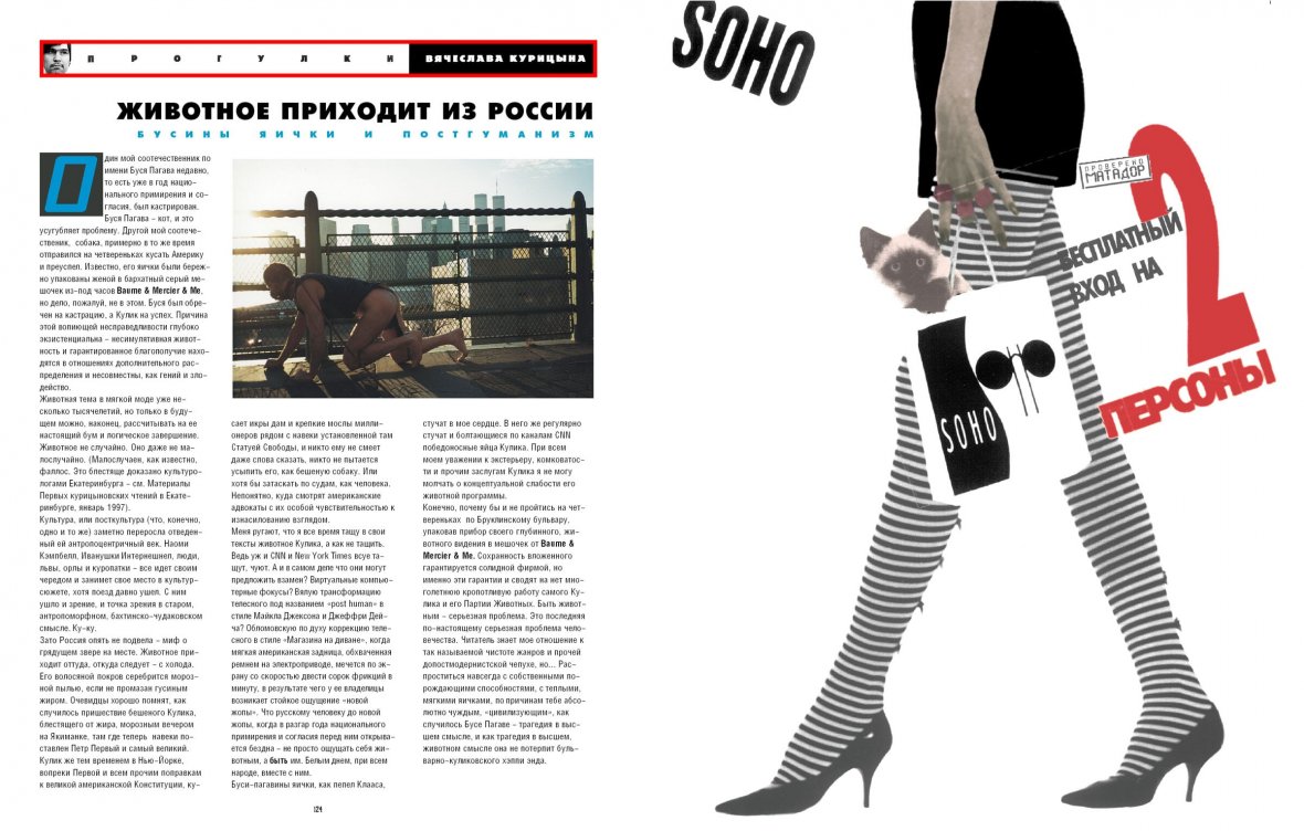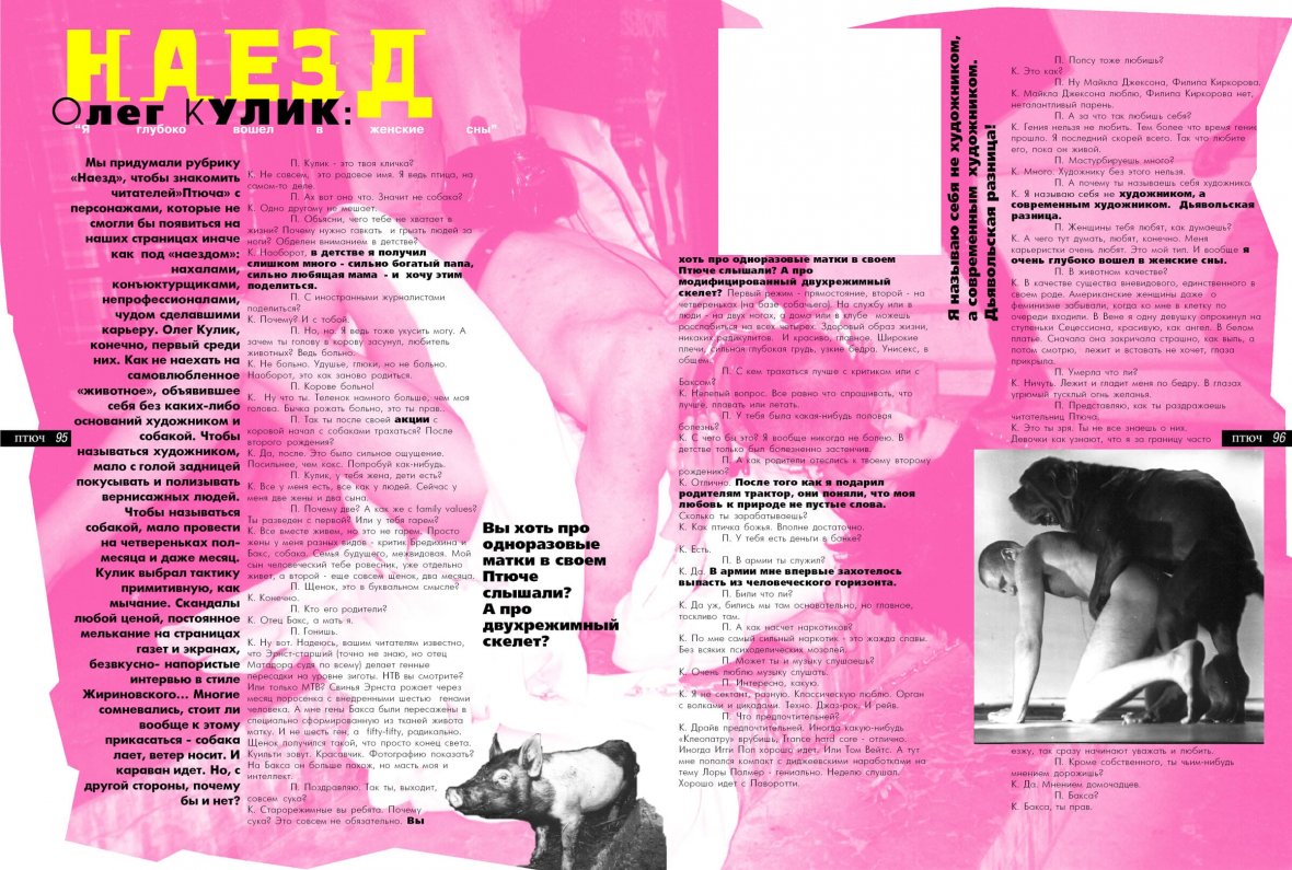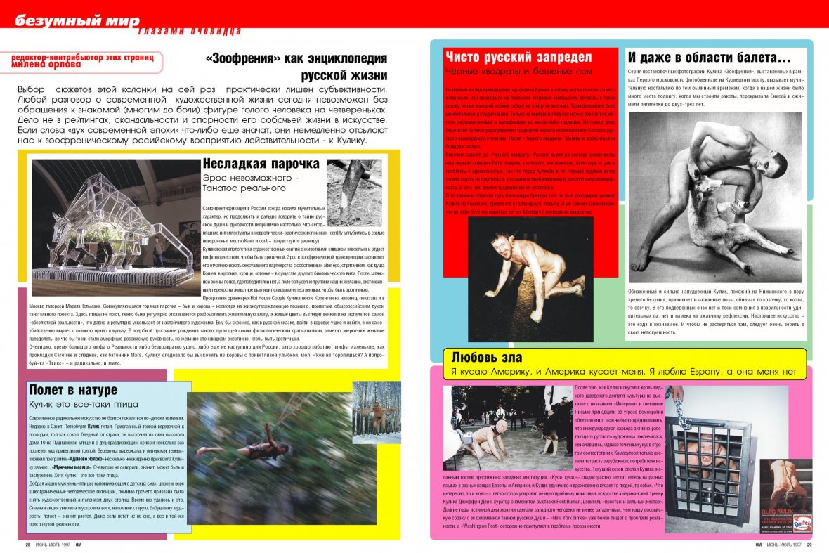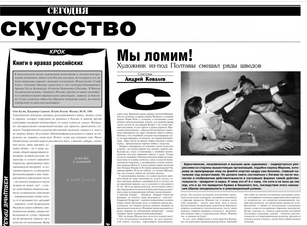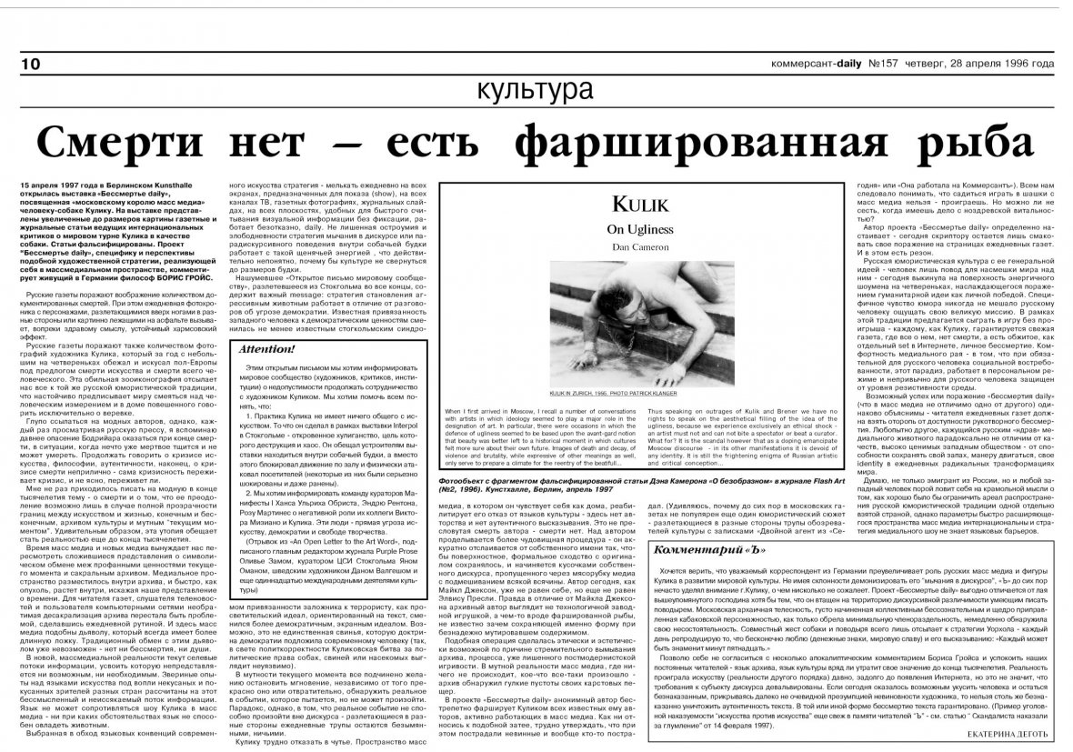 Oleg Kulik is an example. Practically all Moscow critics and almost every media publication have mentioned him. That's why there are two Kuliks: the real and the virtual, or to be more precise there's one artist Kulik and many textual Kuliks, fancy interpretations with pictures.