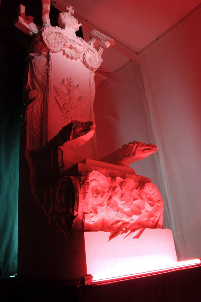 The installation itself is not straightforward political. The artist reveals his visions to us like a pythoness. Maybe there’s a ring of truth, maybe it’s just a magnificent hallucination. His vision flutters between the modern design of a tsarist throne hall and the tower of the Master Control program. The red carpet - or is it a coordinate grid – multiplies in the curvy mirrors. Viewers – are they the court waiting for the royal appearance, or users queued to the mainframe terminal, or programs locked in the matrix?
