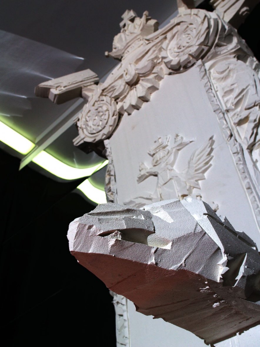 Sergei Shekhovtsov is a sculptor who makes strange things out of a strange stuff. Mattress, sponge, packaging, what else is made of foam rubber. And Shekhovtsov carves-cuts-chisels motorbikes, people, doves, robots, architecture, even whole installations out of this garbage plastic. His hands turn the foam into a classical sculpture material, making you question your own senses – what’s that pillowy but rigid, massive yet weightless.