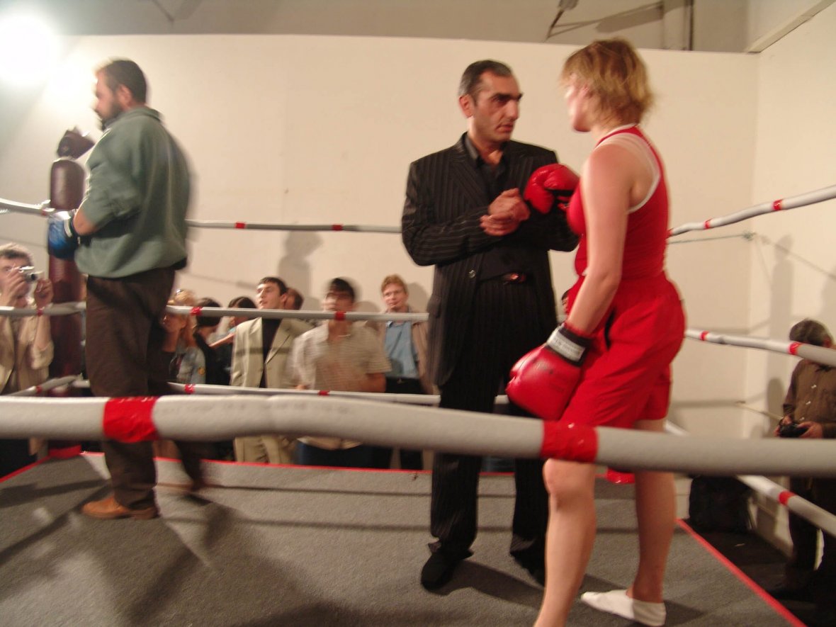 The artist’s color palette is rather simple. Yet effective. The red color attracts. Here I must say about her red bra under translucent blouse. She just finished her studies in Switzerland and debuted in Moscow with her video Into the future: forced herself – in underwear only - into a fictitious gallery door, fervent to get into the future.