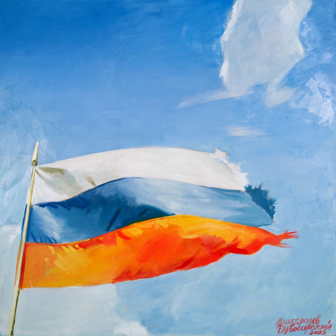Пусть никого не пугает одиозная формула, выведенная в название. Никаких пессимистических ассоциаций. Если прочитать ее без подтекста, привнесенного извне, то она будет означать всего лишь качественную оценку уровня произведений творческого дуэта Дубосарский-Виноградов. В принципе уже не так уж важно какова тема художественного высказывания партнеров - стилистика найдена, подход определен, зритель, особенно заинтерессованный - доволен. Даже счастлив, потому что мощный поток позитивной энергии буквально сбивает его с ног.