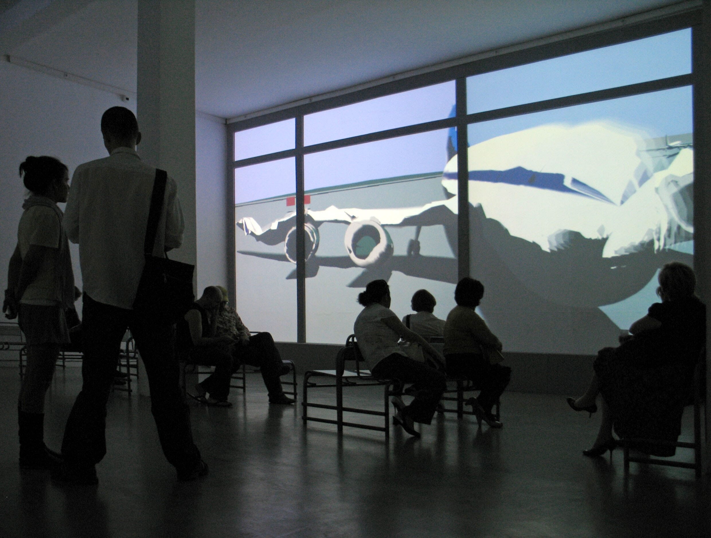 «Зал ожидания» молодого петербургского художника Максима Свищева – своего рода стравливание авиа-страхов друг с другом. Самолет, эта надменная механическая птица, полагающая, что, купив билет, ты полностью оказался в ее власти: захочет – поднимет в небеса и сбросит оттуда, захочет – будет красоваться перед тобой, запертым и беспомощным, по летному полю, здесь подвергается ритуальному разрушению и осмеиванию. Авиакатастрофа происходит не в воздухе, а на земле – неведомые силы из «Сумеречной зоны» любезно спустились в аэропорт, чтобы изничтожить воздушное судно прямо здесь. Лететь уже никому никуда не придется. И слава богу.