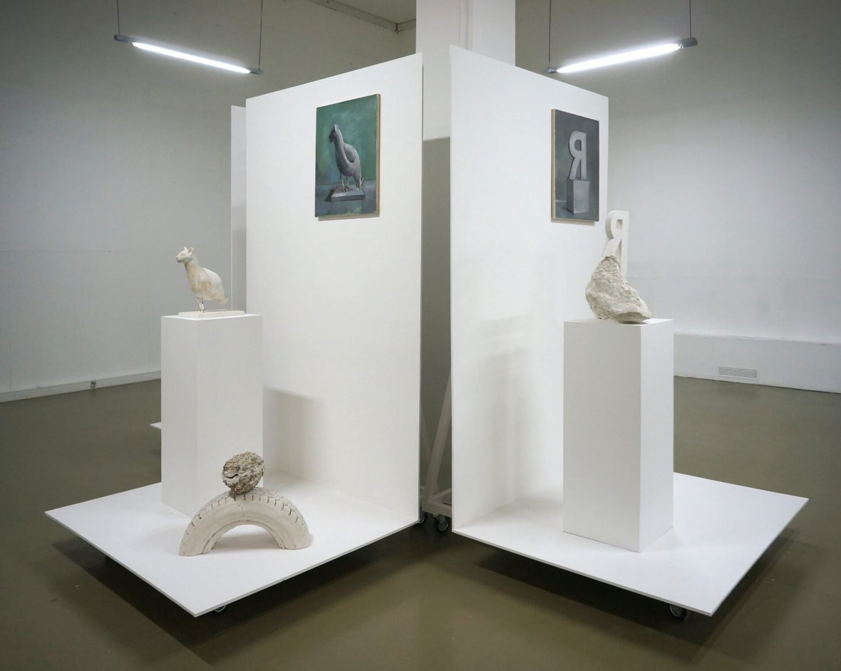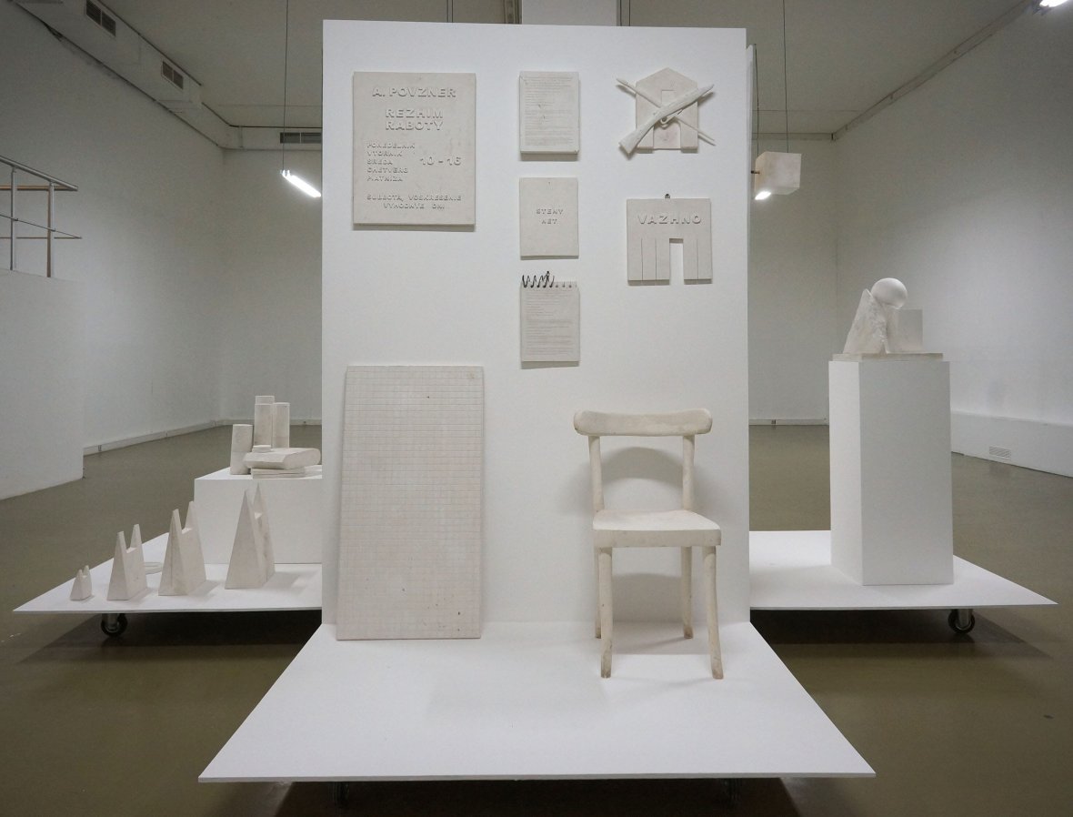 На восьми стендах размещен «Отчет о проделанной работе» с еле уловимой мелодраматической поэтикой, скрытой грубыми формами и стерильным белым. Гипсовые таблички Повзнера – мемориалы повседневности, написанные компьютерным транслитом: русские слова в вольной латинской транскрипции – напоминают скрижали, которые, к слову, и должны быть квадратной или прямоугольной формы согласно Талмуду, как у Моисея Микеланджело, а не привычной дугообразной, как у Моисея в исполнении Густава Доре, например. В известном классическом сериале пророк разбивает выбитое на камне послание бога, когда застает народ за поклонением золотому тельцу. А Повзнер берет на себя смелость вернуть современному зрителю искусство не-проектного образца. Так как сам по себе отчет о проделанной работе – это что-то из далекого прошлого, в котором художники тихо работали по своим мастерским и с некоторой периодичностью представляли результат на суд публики. Не заказ, будь то частный, государственный или ритуально-религиозный, а собственный независимый труд. Выставлять разрозненные штудии вместо цельного концептуального проекта сегодня – моветон, но в нем и заключается субверсивный ход автора.