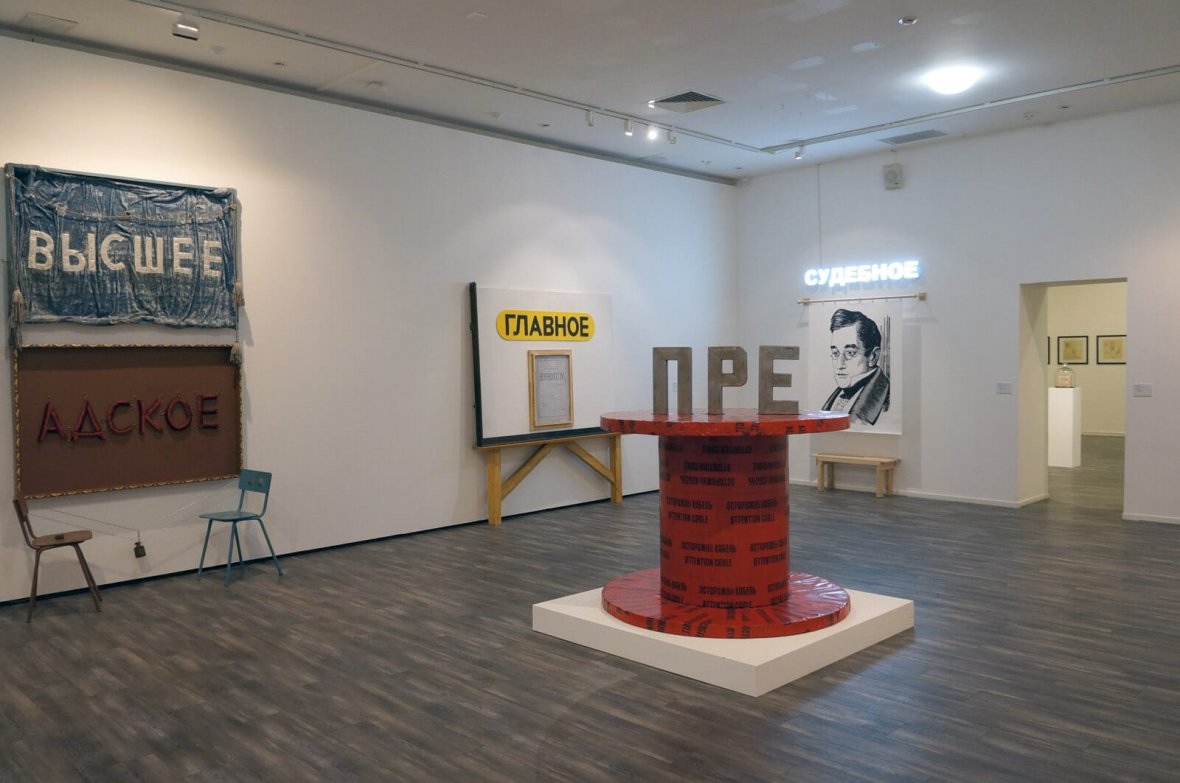 Экспозиция развивается от контекстных, атмосферных инсталляций «Круг жизни», «Круг КД» и «Контекст» к концентрации поиска последнего десятилетия в трех залах с общим названием «Русский космизм», связанных с аспектами учения Николая Федорова, до знаковых произведений, среди которых важные опоры для становления общего стиля — «Закрытая рыбная выставка», «Грибы русского авангарда», «Русская идея» и другие. В контекст выставки также включены и сольные произведения авторов: произведения 1970–1980-х годов «Частичное изменение», «Музей Борисова» и «История шкафа» (Игорь Макаревич) и «Лаборатория великого делания» и «Объекты среднего рода» (Елена Елагина).